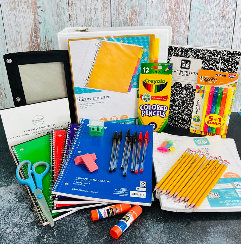 3in White 3-Ring Binder, Crayola Colored Pencils (12), Elmers Glue Sticks (2), #2 Pencils (12), Pink Erasers (2), Pencil Top Erasers (5) (colors vary), Black Bic Pens (5), Red Bic Pens (2), Highlighters (5) (colors vary), Pencil Sharpener (colors vary), 5 Tab Insert Dividers, Pencil Bag (colors vary), College Ruled Filler Paper -2 packs, College Ruled Composition Notebook -2, College Ruled Spiral Notebooks -4 (colors vary), Scissors - Pointed Tip (colors vary)