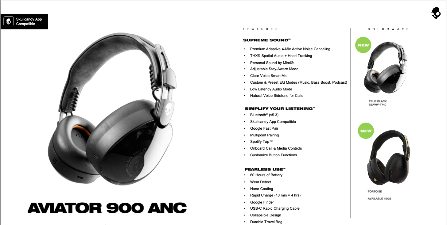 Immerse yourself in 360° audio soundscapes, premium adaptive noise canceling and cutting-edge performance and features. Wrapped in unrivaled comfort and an iconic, retro-inspired design, Aviator 900 ANC sets a new standard for luxury listening — effortless, elevated, and unmistakably Skullcandy.
